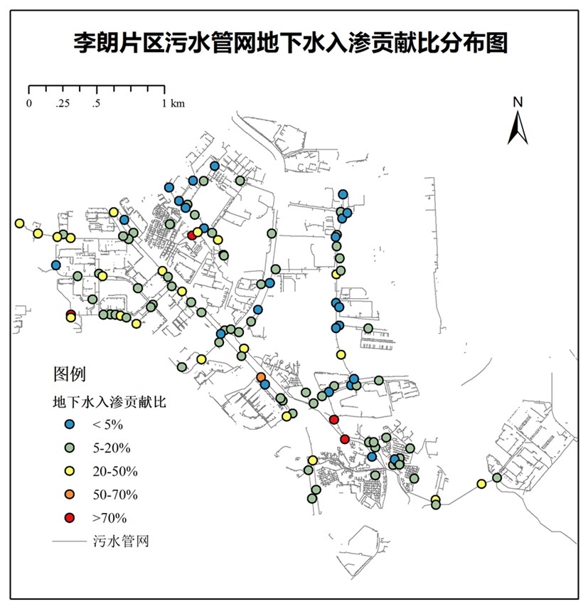 2)地下水外水混入定量评估:利用端元混合模型,针对各个采样点的地下水混入比例开展定量计算。结果表明,李朗片区管网存在不同程度的渗漏。部分点位地下水混入百分比低于5%,可认为无渗漏,这些点位主要分布在小区的支管;小区出口后次干管渗漏量增大,在5-20%之间,属于轻微渗漏;更大一级的干管渗漏量明显增大,渗漏率大于20%,属于中等渗漏;严重渗漏和极严重渗漏的点位较少,仅零星分布在支管处,且分布没有空间规律。进一步,溴离子示踪技术表明,通过投加外源示踪剂,在上下游监测断面开展溴离子连续监测,可以有效确定监测段外水渗入及管网漏损情况。